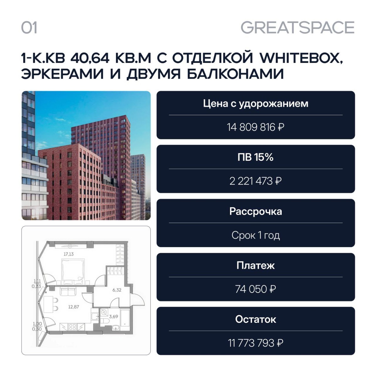 Пока вы читаете этот пост — кто-то уже подписывает бронь (и это не метафора, а реальность этой квартиры) Сегодня хотели рассказать про очень симпатичную 1-комнатную квартиру — 40,64 м² счастья со стильной планировкой и очень приятной скидкой в 5 млн. рублей. Но... её уже забронировали наши клиенты, пока мы набирали текст поста. Хорошие новости есть — мы можем подобрать вам такую же. И на таких же крутых условиях. Смотрите, какие расчёты были на эту квартиру: Цена квартиры прайс: 19 321 352 р. Цена со скидкой: 14 491 014 р. 1️⃣ Рассрочка с минимальным первоначальным взносом (предусмотрена небольшая наценка) • Цена с удорожанием 14 809 816р. • ПВ 15% = 2 221 473р. • Ежемесячный платеж в течение 12 мес. = 74 050р. • Остаток суммы через 12 мес. = 11 773 793р., возможен переход на ипотеку 2️⃣ Семейная ипотека • Цена квартиры 14 491 014 р. • ПВ 20% = 2 898 203р. • Ипотека = 11 592 811р. • Ставка 6%, срок 360 мес. • Ежемесячный платеж = 69 505 р. 📱Хотите рассчитать платежи для себя? П