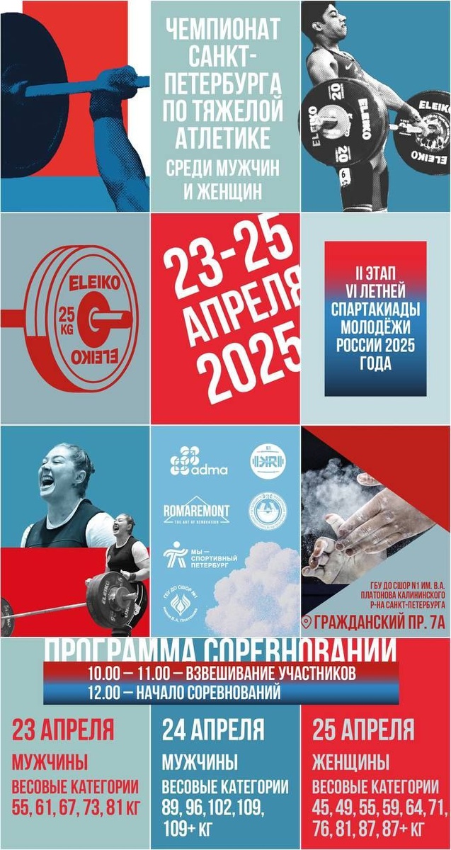 С 23 по 25 апреля в спортивной школе олимпийского резерва №1 Калининского района Санкт-Петербурга им. В.А. Платонова пройдёт чемпионат Санкт-Петербурга по тяжёлой атлетике среди мужчин и женщин. Приходите и болейте за: Кирилла Рябых, Анну Зубко, Кристину Соболь и других звёзд тяжелой атлетики из города на Неве.