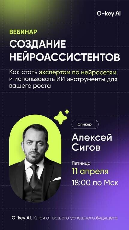 🔥 Друзья, вы точно не можете это пропустить! Сегодня — мощный вебинар с экспертом, который не просто говорит об ИИ, а строит на нём бизнесы 💼 👨🏫 Алексей Сигов — кандидат экономических наук, AI-предприниматель, эксперт по блокчейну и нейросетям, человек, который запускал розничные блоки в банках «с нуля» и теперь помогает другим масштабироваться с ИИ. 📅 Дата: Пятница, 11 апреля ⏰ Время: 18:00 МСК / Киев / 17:00 Европа / 20:00 Астана 📍 Формат: Zoom (ссылку вышлем перед началом) 🎯 Тема вебинара: Создание нейроассистентов и нейросотрудников 💡 Что вы получите: 1. Обзор всей маркетинговой программы O-Key AI 2. Пошаговый план: как расти, масштабироваться и зарабатывать больше 3. Как стать экспертом в нейросетях и использовать этот статус как инструмент влияния 4. Тактики позиционирования, которые поднимают ваш бренд на новый уровень. 🎁 И это ещё не всё! Каждому участнику — подарок: 30 эксклюзивных промтов лидера O-Key для продаж, продвижения, контента, личного бренда и авт