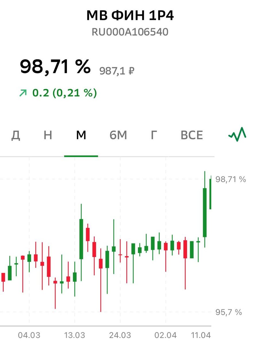 В ответ на пост По МВ Фин 1Р4 ждем оферту, а цена тем временем ползет к 99% Скорее всего буду подавать на выкуп, чем скидывать в рынок. Даже 0,5% это тоже деньги. А вы покупали МВ Фин 1Р4 под рост к оферте? #MVID, #облигации