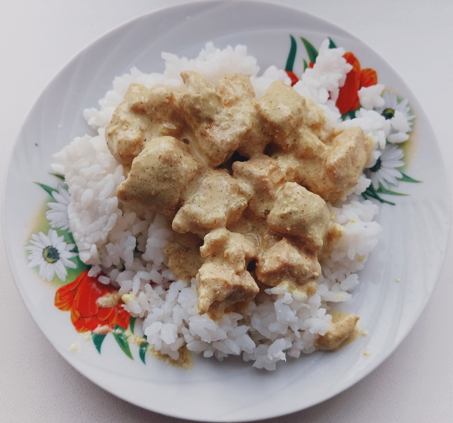 5. Когда лук обжарился, добавляем соль, 2 ч. ложки карри и 200 мл сливок. Перемешиваем содержимое сковороды. Оставляем курицу тушиться в сковороде без крышки на минимальном огне 20 минут.