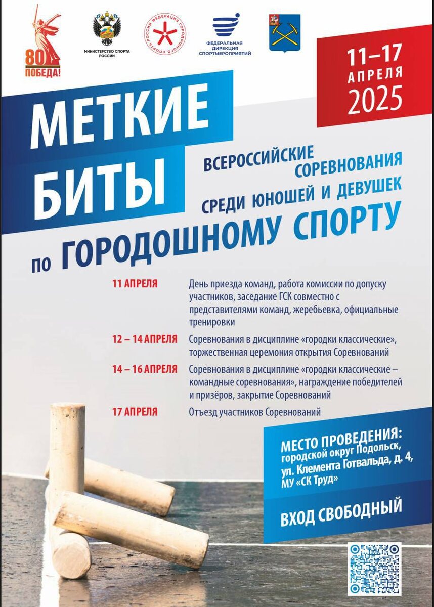 ✨ Городошный спорт 🏆 "Меткие биты": в Подольске пройдут Всероссийские соревнования по городошному спорту. 📍В соревнованиях примут участие юноши и девушки в возрасте от 11 до 18 лет из таких городов, как Саратов, Нижний Новгород, Санкт-Петербург, Томск и многих других. 🏅 Торжественное открытие соревнований состоится 12 апреля. 🚫 Возраст: 6+ 📆 12.04.2025 🕒 12:00 🏢 Спортивный комплекс "Труд" 📍 г. Подольск, ул. Клемента Готвальда, 4, стр. 1 💰 Вход свободный❗️ #webПодольск ✅ Мероприятия Подольск https://dzen.ru/id/66ed500f7b5671493eca3fd6 http://vk.com/podolsk_events http://dzen.ru/podolsk_events