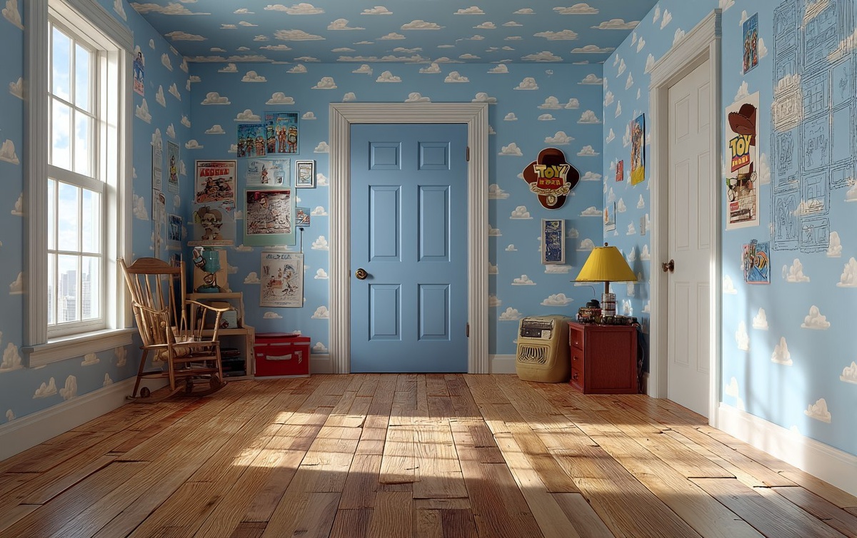 Создано на основе запроса: A Toy Story-inspired room featuring a blue sky and white cloud wallpaper, iconic to Andy’s room