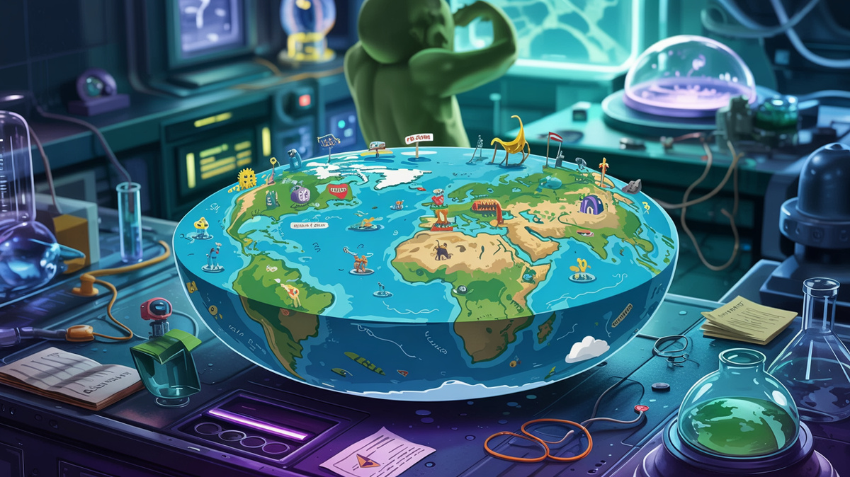 Учёные изобретают теорию плоской Земли. Пролог. Скука в Галактическом Совете. — Коллеги, — вздохнул Главный Научный Руководитель, — люди начали слишком много понимать. Они уже догадываются, что Земля круглая, знают про гравитацию и даже запускают спутники. Это недопустимо! — Может, устроим им ещё один ледниковый период? — предложил Квок. — Слишком дорого. — Тогда добавим новый вирус — «ковид-3000»? — Нет, они только обрадуются — снова будут сидеть дома и смотреть Netflix. — Я знаю, что сделать! — вдруг завопил Зррх, опрокидывая стеллаж с образцами «Лунных заговоров». — Дадим им теорию плоской Земли! Глава 1. Первые шаги: «А что, если…» — Так, — начал Зррх, рисуя в воздухе голограмму, — мы говорим им, что Земля на самом деле плоская, а все фото из космоса — это подделка NASA. — Но… но у нас же есть записи, как мы её лепили круглой! — возмутился Квок. — А кто это проверит? — Люди уже летали в космос! — Ну и что? Мы просто скажем, что космос — это голограмма, а гравитация — обман. — … —
