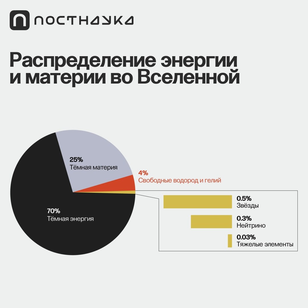 Тёмной материи во Вселенной в 5 раз больше обычной, и мы не знаем, из чего она состоит Обычная материя (всё, что мы видим) составляет всего 5% от того, что есть во Вселенной. Ещё около 70% называют тёмной энергией. Отдельная загадка физики. Это субстанция, которая не подчиняется обычным законам, по которым ведёт себя материя. Примерно 25% — тёмная материя. Мы не видим её, потому что она не светится. Считается, что тёмная материя состоит из частиц, которые не испускают свет. Эти частицы должны быть долгоживущими и существовать со времён Большого взрыва. Под описание частично подходит нейтрино. Но нейтрино — очень лёгкая частица, и из неё не получится «сделать» тёмную материю. Выходит, среди известных науке частиц нет подходящих кандидатов на роль тёмной материи. 5 загадок физики
