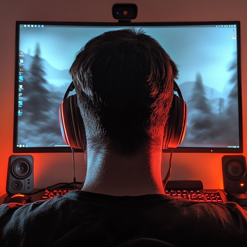 Создано на основе запроса: A gamer from behind, sitting in front of his monitor and gaming desktop