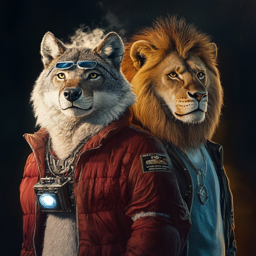 Создано на основе запроса: Make a Wolf and a Lion as the main characters of the movie Back To The Future, principal poster style