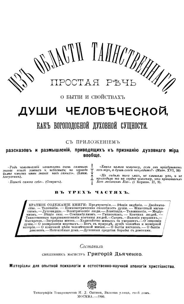 "...Враждебное отношение «просвещённых» противников к некоторым новым фактам, доказывающим бытие духовного мира, хорошо известно: стоит припомнить историю развития человеческой мысли, чтобы убедиться, что все великие и важные истины должны были пройти через горнило испытаний, которым их подвергали приверженцы ходячего мировоззрения, не способные отрешиться от рутинного отношения к окружающему миру и ориентироваться среди новых явлений, не укладывающихся в заранее составленные, по однажды зазубренными учебникам, рамки.