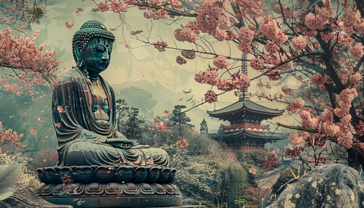 Создано на основе запроса: texture, buddha, Japanese edo era style, full body sitting on deep meditation , surrounded by sakura trees, with
