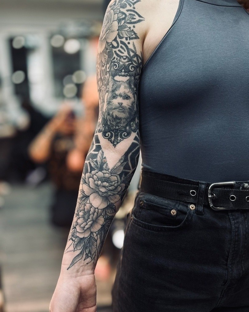 Плотный но при этом нежный орнаментал с цветами от тату мастера Кирилла