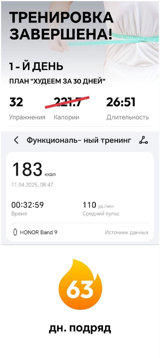 🏋️♂️ Упражнения. День 63. 🗓 11.04.25 💪 День похудения: 93 ⏱ 00:32:59 🏄♂️ 183 ккал 😃 Сегодня перешёл на новую сложность комплекса упражнений. 💪 В целом нормально пошло. Завтра по расписанию день отдыха. 😃 Посмотрим, что будет в воскресенье, когда я к этому же комплексу добавлю ещё упражнений... ✍️ Присылайте в комментарии свои активности за день! #жжем_калории 😎 Roman Legas | Life