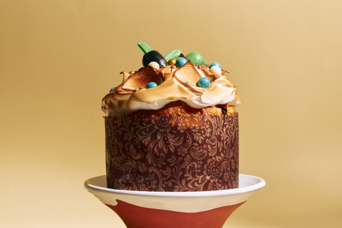 Для ресторана Meraki кулич стал воплощением легкости, красоты и утонченности. Лимонный курд, воздушное тесто с цукатами, изюмом, свежими апельсинами и курагой создают гармоничную вкусовую палитру, которая словно преображает праздник. Декор кулича украшен шоколадными оливками и лепестками, что отсылает к греческой культуре и символике Пасхи. На вершине — обожжённая меренга с изысканными узорами, а голубые сахарные шарики добавляют красок, напоминая о цветах интерьера ресторана Meraki, где каждый элемент сочетает в себе эстетику и гармонию.