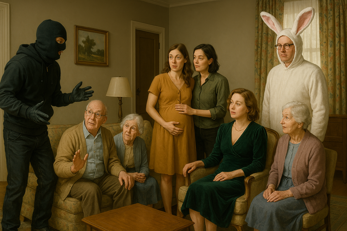 Сюжет завязан на, казалось бы, нелепом инциденте: неудавшийся грабитель банка берёт в заложники случайных посетителей показа квартиры. В этом замкнутом пространстве оказываются совершенно разные люди: беременная лесбийская пара, богатая дама с язвительным языком, пожилая супружеская пара, жизнерадостная старушка и мужчина в костюме кролика. Но вместо триллера начинается нечто иное: заложники и грабитель, сами того не желая, становятся группой поддержки друг для друга.