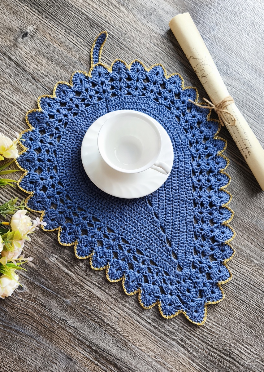 Красивая интерьерная салфетка (или подставка под горячее) в виде листика. Вязала из ниток YarnArt Jeans (цвет синий), крючок № 2,5. Обвязка из нити YarnArt Camellia (металлик) крючком № 2