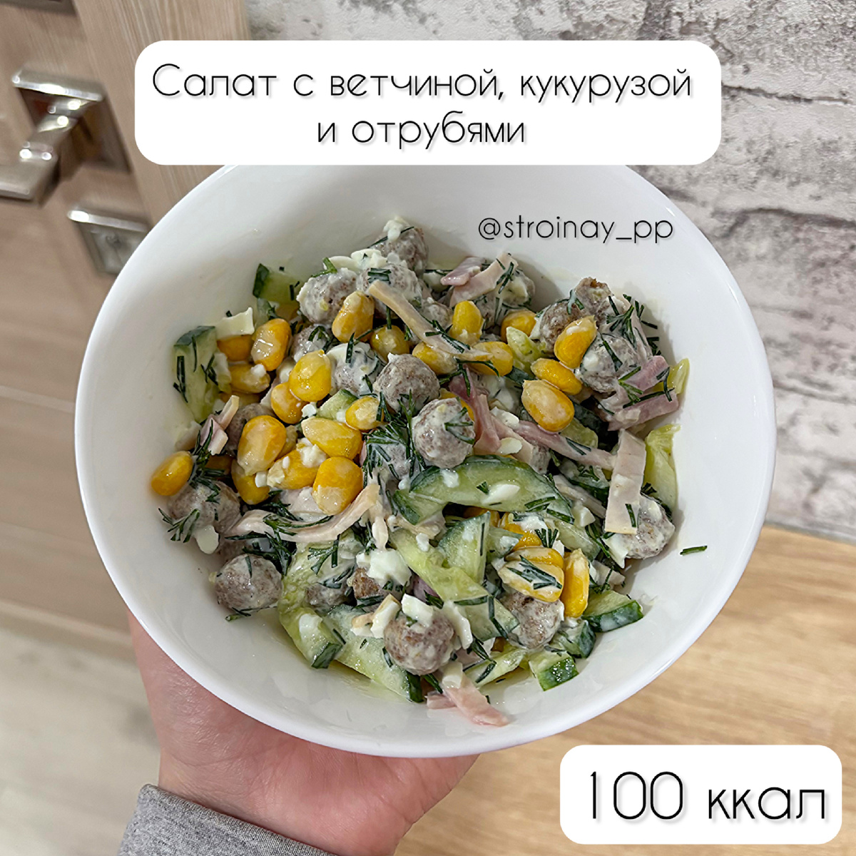 Легкий салатик для ужина 🥗 КБЖУ на 100 грамм: 100/ 6,8/ 4/ 9,1 Ингредиенты: - Огурец 130 гр - Отруби ржаные 25 гр - Яйцо 1 шт (~60 гр) - Сметана 15% 35 гр - Укроп 10 гр - Ветчина из индейки 70 гр - Кукуруза 100 гр #СтройнаЯ #СтройнаЯ_рецепты #ПП #рецепты #похудение #дефицит_калорий #салат #100калорий #низкокалорийные_рецепты