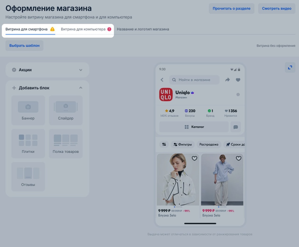 Можно собрать витрину по шаблону или сделать полностью под себя — от цвета до расположения блоков 🔥