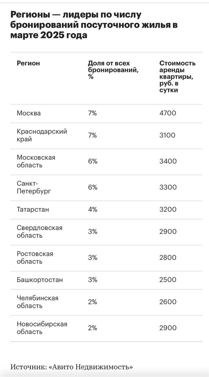 ⚡️ В марте 2025 года посуточные бронирования квартир выросли на 47% Чаще всего в первый весенний месяц туристы бронировали жилье в Москве и Краснодарском крае. Самые популярные направления: 👉Москва и Краснодарский край — по 7% в общем объеме бронирований. 👉Московская область и Санкт-Петербург — по 6%. 👉Татарстан — 4%. 👉Средняя стоимость ночи на период майских праздников составляет 5,45 тыс. руб., что на 19% выше показателя годичной давности.