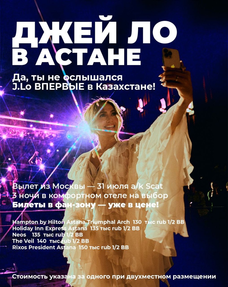 *ДЖЕЙ ЛО В АСТАНЕ!* Бронируйте! Количество мест ограничено!!! 🔥 Да, ты не ослышался — *J.Lo впервые в Казахстане!* Это будет горячо, громко и незабываемо!🔥 Тур на концерт уже в продаже! ✈️ Вылет из Москвы — *31 июля* , а/к *SCAT* 🛎️ Проживание — *3 ночи* в отеле на выбор 🎫 *Билеты в фан-зону уже включены в стоимость!* 🏨 Отели на выбор *(цена за 1 человека при 2-местном размещении, BB):* * Hampton by Hilton Astana Triumphal Arch130 тыс rub 1/2 ВВ • Holiday Inn Express Astana 135 тыс rub 1/2 ВВ • Neos 135 тыс rub 1/2 ВВ • The Veil 140 тыс rub 1/2 ВВ • Rixos President Astana 150 тыс rub 1/2 ВВ ✨ Это твой шанс оказаться на одном из самых громких событий лета! *Возможен расчет с вылетом из любого города и в любой отель!*