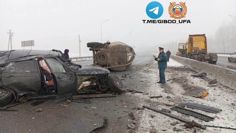 Внедорожник Range Rover, в котором ехала семья с детьми, неожиданно прошел краш-тест на прочность. На Нагаевском шоссе в Уфе водитель цементовоза не справился с управлением, и тяжелая цистерна опрокинулась на легковушку. Жуткий инцидент произошел утром в пятницу, 11 апреля, на Нагаевском шоссе в Уфе. По предварительным данным, водитель большегруза DAF не справился с управлением, что привело к опрокидыванию прицепа. В результате цементовоз рухнул прямо на движущийся в крайнем левом ряду легковой автомобиль, после чего обе машины вылетели на встречную полосу, совершив кувырок через бетонные ограждения.Полиция республики Башкортостан опубликовала запись с видеорегистратора, установленного в машине, которая ехала сразу за Range Rover. На кадрах видно, что водитель внедорожника тормозил и пытался уйти от цементовоза, но возможности для маневра у него не было. В результате ДТП Range Rover получил серьезные повреждения, но все ехавшие в нем люди выжили. Водителя и двоих маленьких детей увезли