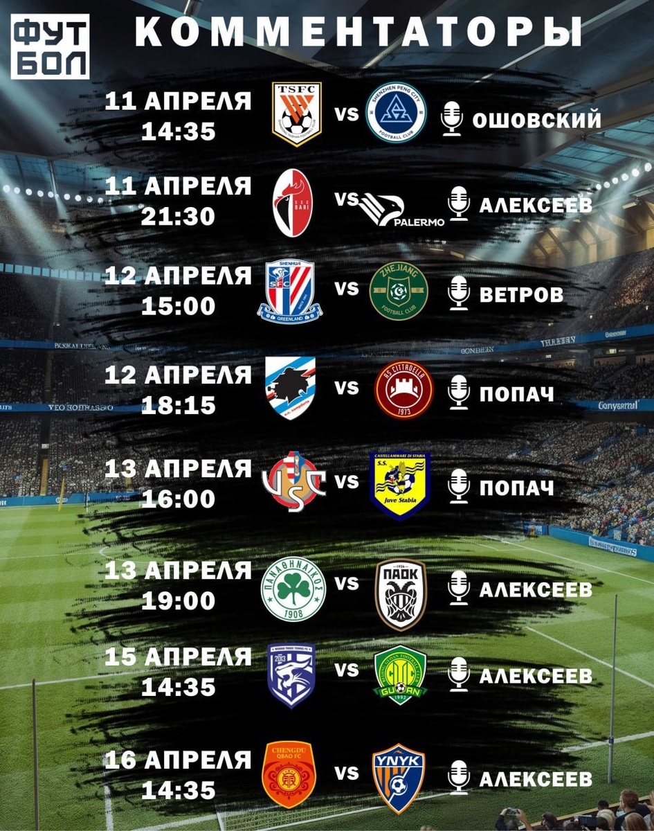 🎙 Комментаторы ближайших матчей на ТК «Футбол» 🇨🇳11 апреля в 14:35 Шандунь Тайшань-Шеньжень Пен Сити (Ошовский) 🇮🇹11 апреля в 21:30 Бари-Палермо (Алексеев) 🇨🇳12 апреля в 15:00 Шанхай Шенхуа-Чжэцзян (Ветров) 🇮🇹12 апреля в 18:15 Сампдория-Читтаделла (Попач) 🇮🇹13 апреля в 16:00 Кремонезе-Юве Стабиа (Попач) 🇬🇷13 апреля в 19:00 Панатинаикос - ПАОК (Алексеев) 🇨🇳15 апреля в 14:35 Ухань ТТ-Бейцзинь Гоань (Алексеев) 🇨🇳16 апреля в 14:35 Ченду Жунчен-Юньнань Юйкунь (Алексеев)