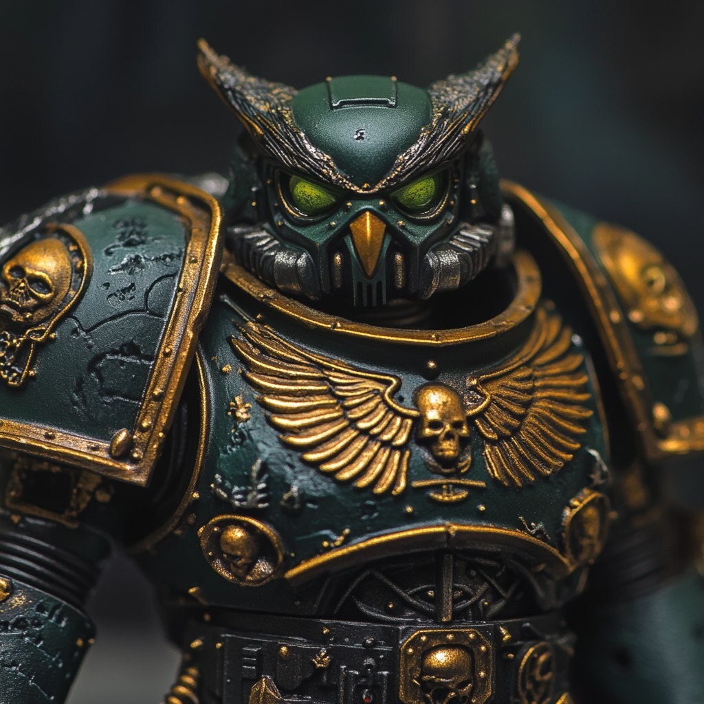 Создано на основе запроса: terminator from the w40k universe, owl head, dark green and gold armor
