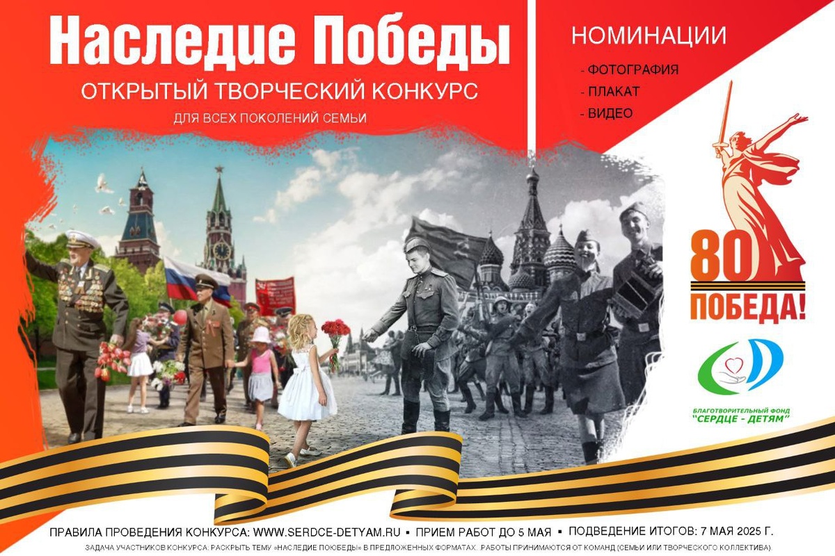 🇷🇺 ВНИМАНИЕ, КОНКУРС! 🇷🇺 Благотворительный Фонд "СЕРДЦЕ - ДЕТЯМ" объявляет о приеме работ на открытый конкурс "НАСЛЕДИЕ ПОБЕДЫ" Участникам предлагается представить творческую интерпретацию Наследия Великой Победы в войне 1941-1945 гг: как понимается эта фраза, что она означает для вашей семьи и/или лично для вас. 🏆 КОНКУРСНЫЕ ЗАЯВКИ ПРИНИМАЮТСЯ В ТРЕХ НОМИНАЦИЯХ: - фотография на тему "Этот особенный день 9 мая" - плакат, соответствующий теме конкурса и стилистике советских плакатов времен ВОВ - видео (стихотворение на тему Великой Отечественной войны и Победы, разыгранная сценка, либо исполнение песен военных лет) 🥇Победителям будут вручены призовые боксы с подарками от наших спонсоров, а также памятные дипломы и грамоты. 👪 УЧАСТВОВАТЬ МОГУТ семейные команды, а также творческие коллективы/объединения. 🔗 Ограничений по возрасту участников нет. 🔗 Количество конкурсных работ от одного участника (команды) не ограничено. Прием работ до 4 мая. Подведение итогов конкурса и