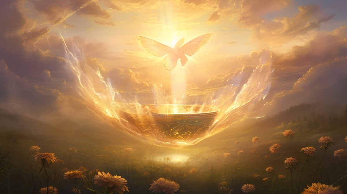 Создано на основе запроса: A symbolic rebirth scene glowing cradle amidst a meadow, sunlight breaking through clouds, a butterfly or dove