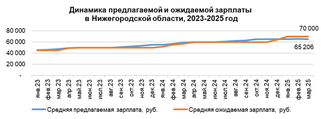 По итогам января-марта 2025 г. в Нижегородской области средняя предлагаемая зарплата составила 65,2 тыс. руб., сообщает hh.ru. С начала года потенциальные доходы нижегородцев выросли только на 0,2 тыс. руб., тогда как в аналогичный период 2024 г. — на 4,4 тыс. руб. Самое заметное падение предлагаемой зарплаты в регионе было зафиксировано в сфере административного персонала: в январе 2025 г. кадрам из этой области предлагали более 64 тыс. руб., сейчас — на 11 тыс. руб. меньше. Также более чем на 10 тыс. руб. снизился предлагаемый доход в вакансиях для обслуживающего персонала, на 9 тыс. руб. — в предложениях для транспортников. Таким образом, за три месяца размер заработных плат снизился в сферах: автобизнес, рабочий персонал, массмедиа, топ-менеджмент. В свою очередь, зарплатные запросы нижегородцев выросли и обогнали предложения работодателей. Сейчас местные соискатели хотят зарабатывать не менее 70 тыс. руб. в месяц. Зарплатные ожидания жителей региона начали превышать работодательск