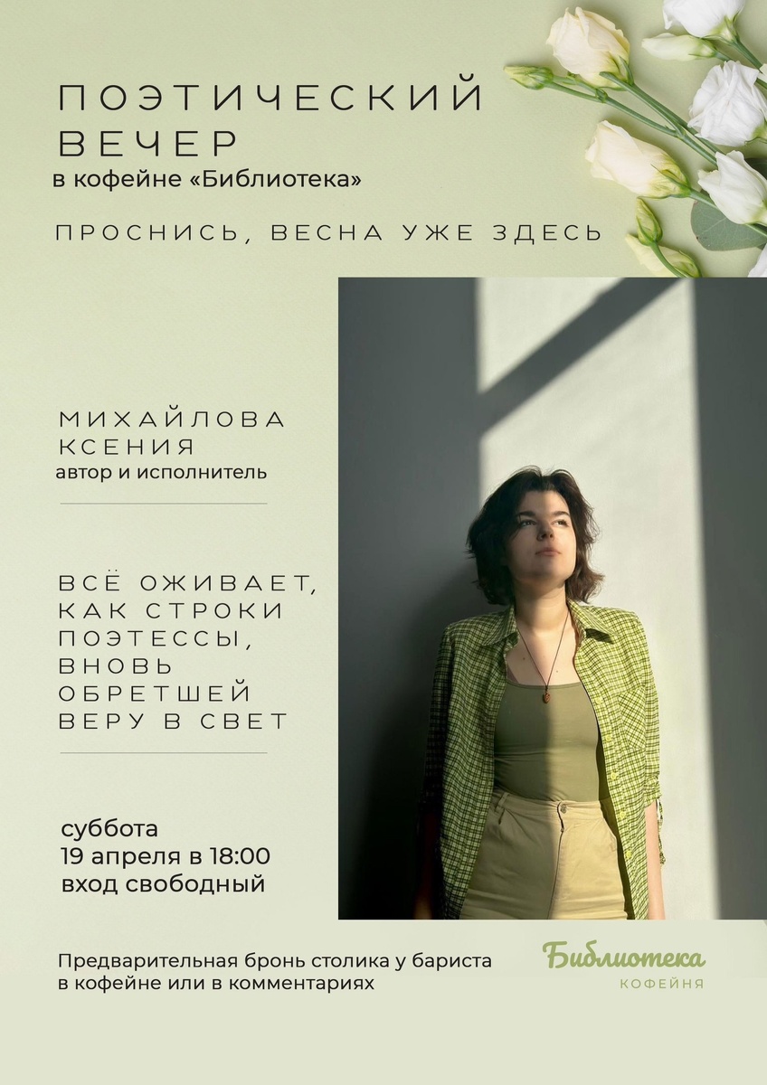 π£19 Π°ΠΏΡΠ΅Π»Ρ Π² 18:00 Π² ΠΊΠΎΡΠ΅ΠΉΠ½Π΅ Β«ΠΠΈΠ±Π»ΠΈΠΎΡΠ΅ΠΊΠ°Β» Π² ΠΠ±Π½ΠΈΠ½ΡΠΊΠ΅ ΡΠΎΡΡΠΎΠΈΡΡΡ ΠΏΠΎΡΡΠΈΡΠ΅ΡΠΊΠΈΠΉ Π²Π΅ΡΠ΅Ρ. Π Π³ΠΎΡΡΡ