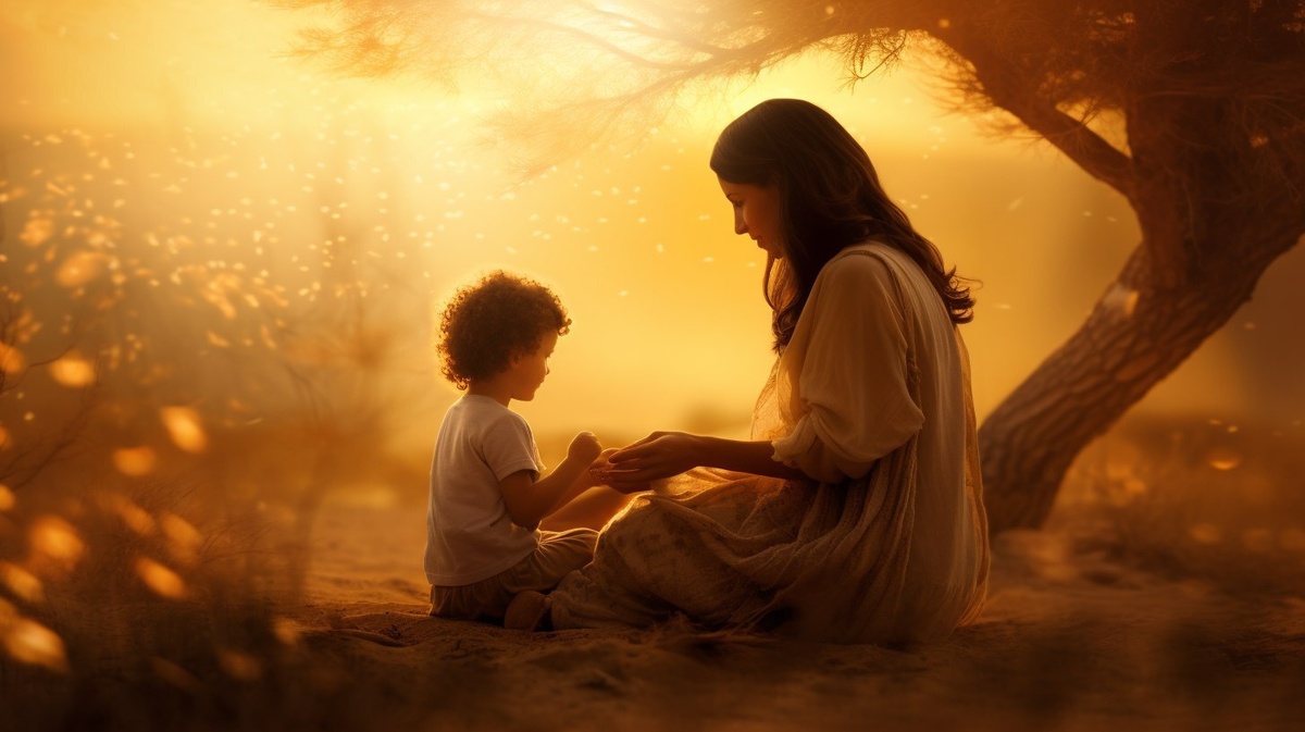 Создано на основе запроса: A woman feeding her child under a tree, with a faint translucent image of her own mother in the golden sky or