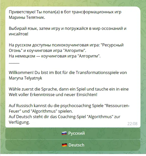 Привет! Я хочу поделиться своим опытом создания чат-бота для трансформационной игры «Ресурсный огонь». Это психологическая игра, которая помогает человеку разобраться в себе, осознать текущее состояние и найти путь к ресурсному, наполненному состоянию. Игрок словно проходит внутреннее путешествие — с вопросами, метафорами и важными инсайтами. В этой статье расскажу, какая была задача от заказчика, и что из этого получилось. Расскажу про один проект. Эксперт составила свои трансформационные оффлайн-игры и решила перенести их в онлайн. Не каждый может прийти на личную сессию - с онлайн-вариантом возможностей намного больше. Я в детстве очень любила игры-ходилки, поэтому собрать такой чат-бот было интереснейшей задачей. Изначально я собирала одну игру - Ресурсный огонь, далее сделала вторую - Алгоритм Успеха. Вот во вторую можно поиграть на 2 языках, поэтому в бот было добавлено это меню. В этой статье расскажу про первую - Ресурсный огонь. Итак, бот нас приветствует и предлагает выбрат
