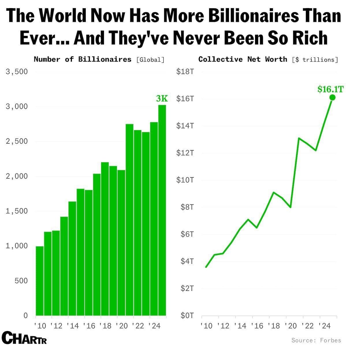 🔸Количество долларовых миллиардеров достигло нового рекорда — 3028 человек, это в 3 раза больше, чем в 2010 году. Их общее состояние $16 трлн.