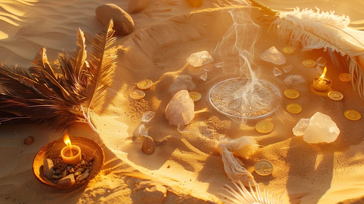 Создано на основе запроса: photo-realistic desert scene, circular setup of feathers, crystals, burning sage, gold coins, silk fabrics on