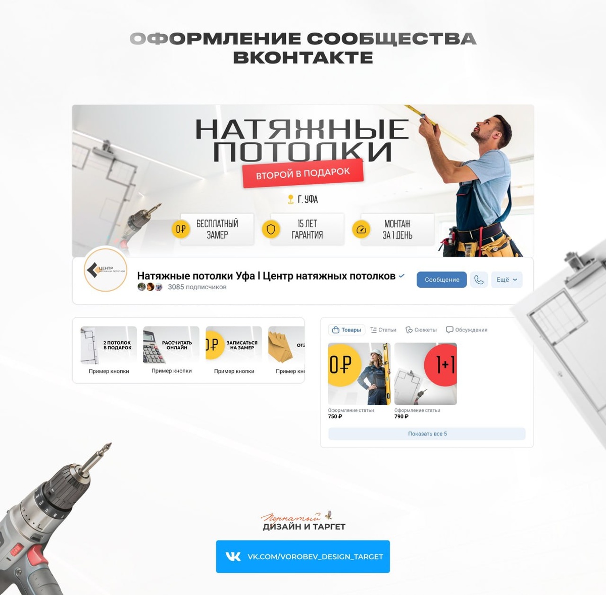 ОФОРМЛЕНИЕ СООБЩЕСТВА ПО НАТЯЖНЫМ ПОТОЛКАМ Что сделано: ✅ Создан баннер с акцентом на ключевые преимущества — "Второй в подарок", бесплатный замер, гарантия 15 лет, монтаж за 1 день. Эти триггеры важны для быстрой конверсии посетителей в клиентов. ✅ Выбран профессиональный стиль — строгие шрифты, контрастные цвета (жёлтый, белый, чёрный, красный), которые привлекают внимание и подчёркивают надёжность компании. ✅ Разработаны кнопки с призывом к действию — "Рассчитать онлайн", "Записаться на замер", "2 потолка в подарок". Это помогает клиентам быстро совершить нужное действие, снижая количество отказов. ✅ Оформлен раздел "Товары" — выделены акции и спецпредложения, что стимулирует покупки. Почему это важно для продаж: 📌 Простая навигация — пользователь сразу видит ключевые УТП и может быстро заказать услугу. 📌 Визуальный триггер доверия — строгий, минималистичный дизайн создаёт впечатление надёжности. А ваше сообщество привлекает клиентов? Нет? 🤙 Напишите мне https://vk.me/vorobev_