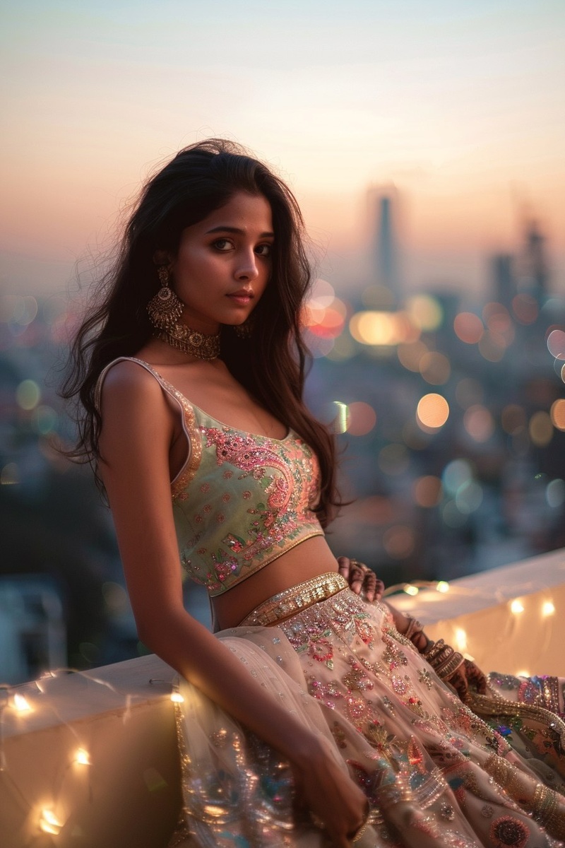 Создано на основе запроса: A glamorous Indian female fashion influencer posing in a luxurious lehenga on a rooftop at sunset, Mumbai skyline behind, Canon RF 50mm f/1.2L lens, bokeh background, soft lighting, photorealism, confident expression, 2:3 ratio