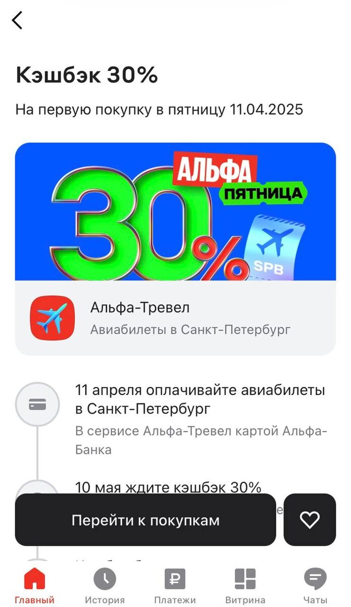 Крутить барабан не нужно - сегодня действует 30% кэшбек на одну покупку авиабилетов туда и обратно/туда в Санкт-Петербург. Покупать билеты надо в разделе Тревел приложении банка. Перелет должен быть до 30 июня.