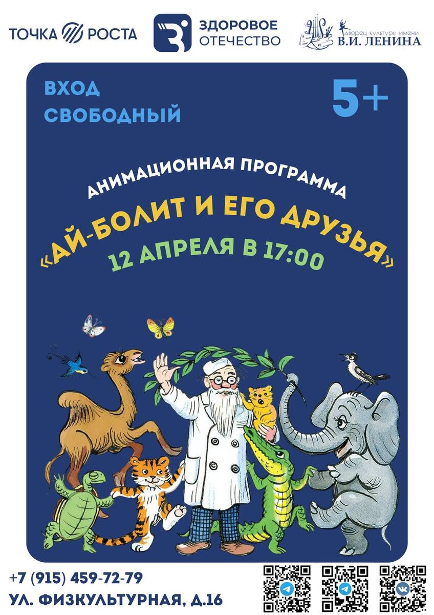 ✨ Анимационная программа «АЙ-БОЛИТ и его друзья» посвященную Всемирному дню здоровья👩🏼⚕️ Детей ждёт: ☀️Спортивно-развлекательная анимационная программа с участием Серпуховского детского музыкального театра «Зазеркалье» ☀️Дискотека ВХОД СВОБОДНЫЙ (по предварительной записи)❗️ ✍️Записать ребенка вы можете у администратора ДК или по телефону: +7 (915) 459-72-79 🚫 Возраст: 6+ 📆 12.04.2025 🕒 17:00 🏢 ДК им. В.И. Ленина 📍 г. Серпухов, ул. Физкультурая, д.16 💰 Вход свободный❗️ #webСерпухов ✅ Мероприятия Серпухов https://dzen.ru/id/66f01c6eb4c6fe60c9ca1608 http://vk.com/serpukhov_events http://dzen.ru/serpukhov_events