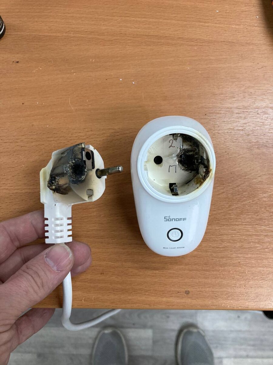 Когда «умный» друг оказался вдруг… Вскрыл умную розетку, внутри нет следов перегрева или расплавления/возгорания. Только снаружи следы перегрева, а из вилки удлинителя отвалился один контакт. Причём предохранитель на 10А не вышибало 🧐