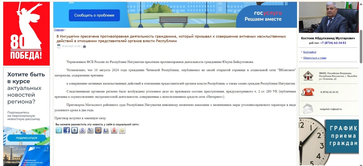 Следствием установлено, что 16 августа 2024 года Байсултанов опубликовал на своей открытой странице в социальной сети «ВКонтакте» материалы, содержащие публичные призывы к совершению насильственных действий в отношении представителей органов власти Республики Ингушетия, а также её граждан.