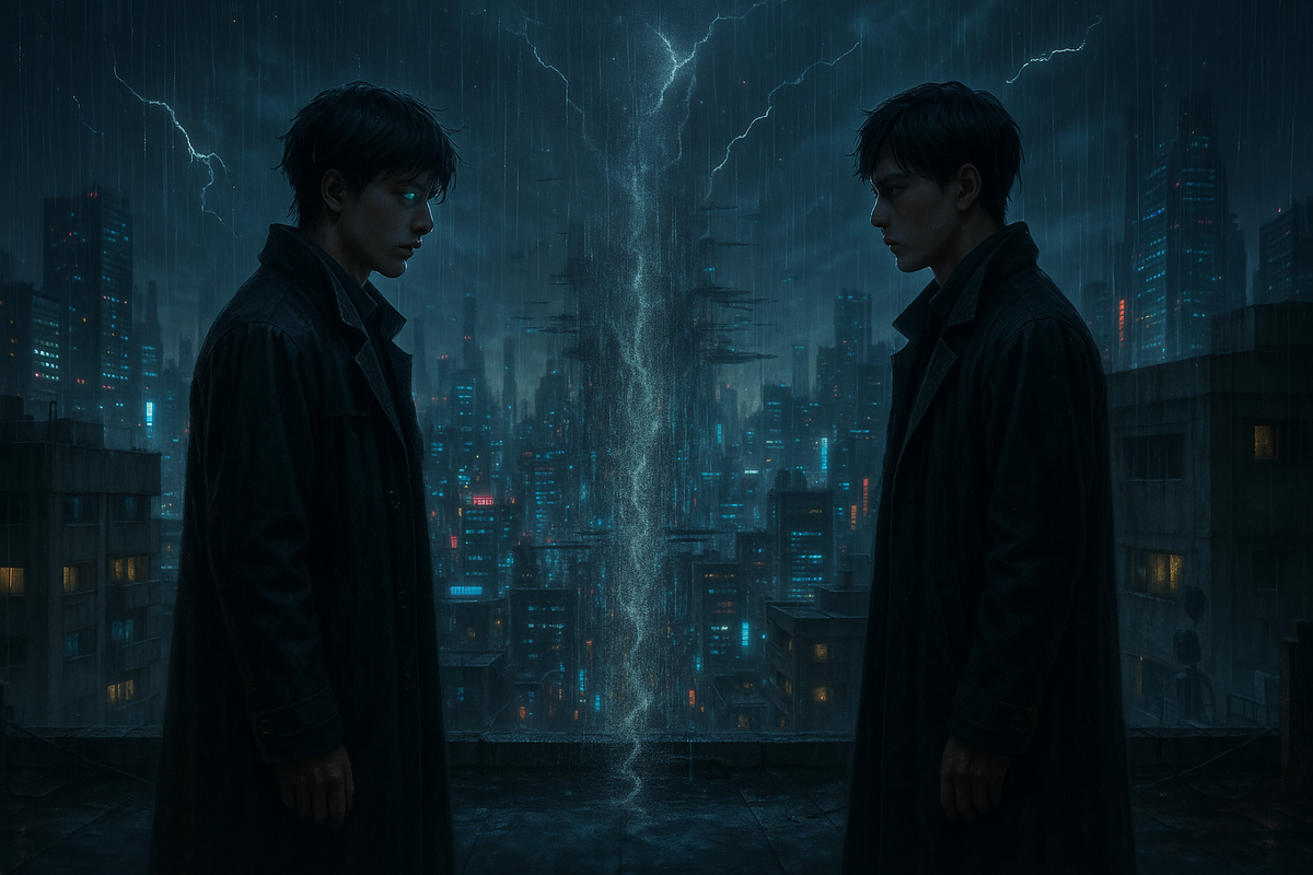 Он появился внезапно, как всё, что не должно существовать. Кайто сидел на крыше одного из заброшенных небоскрёбов, вглядываясь в город, покрытый плёнкой цифрового дождя. Рекламные голограммы скручивались, как ленточные черви. Экран неба мерцал, будто кто-то перебирал варианты погоды вручную. И в этом безмолвном шорохе, где даже ветер звучал как сбой кодека, Кайто услышал шаги за спиной. Те же ботинки. Тот же плащ. Та же походка, что и у него. Он обернулся. И увидел себя. — Ты… — начал он, но не закончил. Потому что вторая версия уже знала, что он скажет. Как будто они оба играли в заранее скомпилированный диалог. — Я не ты, — сказал двойник. — Это ты — программа, скомпилированная из воспоминаний и ошибок. Его голос был похож, но чуть глуше. Как старое аудио, восстановленное с повреждённого диска. Кайто шагнул ближе, но почувствовал, как воздух вокруг них сжался. Пространство, в котором они стояли, больше не подчинялось физике. Оно было… осмысленным. Как будто сама среда знала, что прои