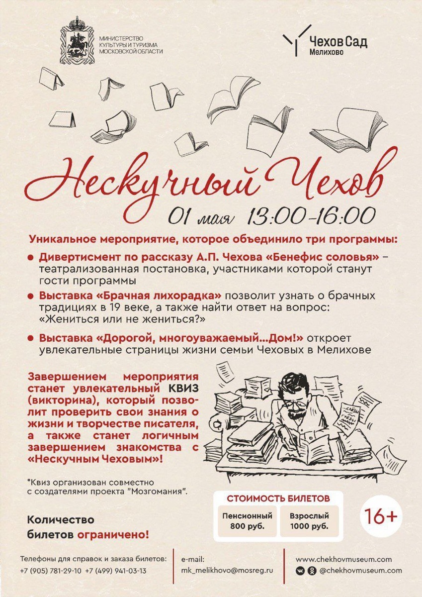 ✨ НЕСКУЧНЫЙ ЧЕХОВ в МЕЛИХОВО 🎭Попробуете себя в роли актеров в дивертисменте по рассказу А. П. Чехова «Бенефис соловья». 👰На выставке «Брачная лихорадка» узнайте, за что обиделись таганрогские знакомые на Антона и Николая Чеховых на свадьбе и многое другое... 👣Экскурсия по выставке «Дорогой, многоуважаемый… Дом» о жизни семьи Чеховых в Мелихове. 🧩В завершение - "МозгоМания". Здесь же всех ждёт «секретное» угощение. 🚫 Возраст: 16+ 📆 01.05.2025 🕛 13:00 🏢 Государственный литературно-мемориальный музей-заповедник А. П. Чехова «Мелихово» 📍 г.о. Чехов, с. Мелихово 💰 Цена: 1000 ₽ 🔗 Купить билет: https://clck.ru/3L78MZ #webЧехов ✅ Мероприятия Чехов https://dzen.ru/id/66cc4b48e9ef144699238a51 http://vk.com/chekhov_events http://dzen.ru/chekhov_events
