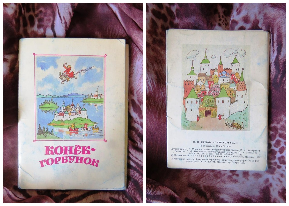 В 1989 году в московском издательстве «Изобразительное искусство выпущен комплект открыток, посвящённый сказке Петра Павловича Ершова «Конёк-Горбунок». На шестнадцати карточках размещены иллюстрации народного художника РСФСР члена-корреспондента Академии художеств СССР Анатолия Владимировича Кокорина (1908-1987). С обратной стороны каждой открытки – иллюстрируемый фрагмент сказки. На обороте обложки вступительная статья Л.А. Астафьева, которая коротко рассказывает о сказочных сюжетах в целом и сказке Ершова в частности. Приведён интересный факт: известность пришла к 19-летнему Ершову после того, как его домашнее упражнение было прочитано на лекции профессора русской словесности Петербуржского университета П.А. Плетнёва. Это и был отрывок из неопубликованной ещё сказки. Комплект в миниатюре воспроизводит некоторые страницы прекрасно изданной книги. Читать удобнее, конечно, книгу. А вот разглядывать детали созданных художником иллюстраций и на открытках можно.