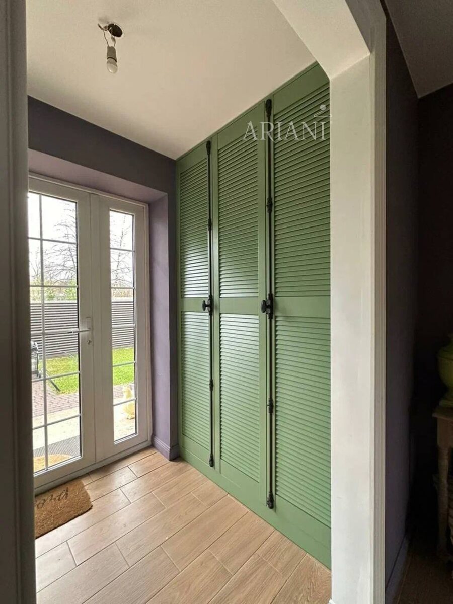 Зелёные шкафы с жалюзийными фасадами добавляют легкости и природной свежести. Они органично сочетаются с зеркальными дверями, которые визуально увеличивают пространство и добавляют света. Практичность и стиль — в каждом элементе.