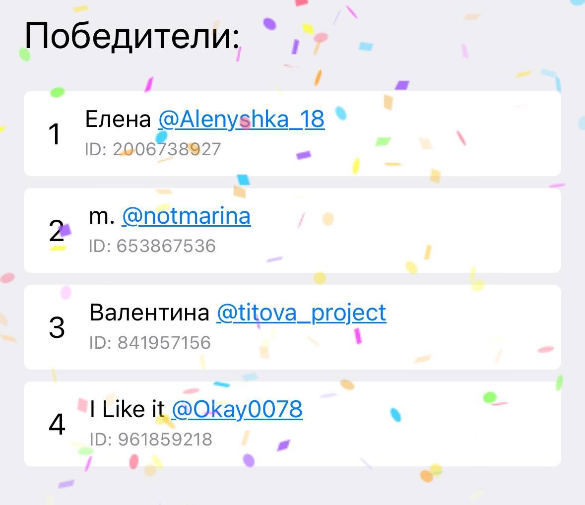 Ну что, друзья, пришло время подводить итоги конкурса 🥳 Поздравляем победителей: 1. Doctor Kukla дарит омолаживающую и обновляющую сыворотку с 10% AHA кислотами, 30 г (стоимостью 8 500 ₽) - Елена @Alenyshka_18 2. Мастерская 7CANDLES подарит свечу "Киндер-сюрприз" (стоимостью 3800р) - m. @notmarina 3. Сеть салонов ОстОптик дарит сертификат на 5000₽ - Валентине @titova_project 4. Арт-пространство "Соул" подарит сертификат на индивидуальное посещение - I Like it @Okay0078