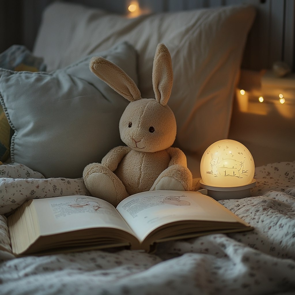 Создано на основе запроса: Children’s bedtime book open next to a plush bunny and nightlight, photographed in evening golden light.