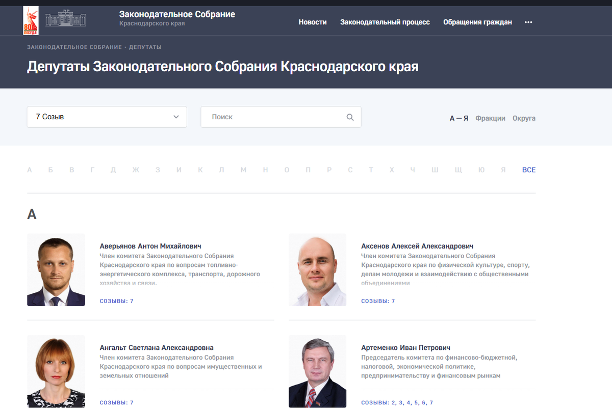 Сводная таблица депутатов Законодательного Собрания Краснодарского края 7-го созыва (2022-2027), отсортированных по алфавиту с указанием их должностей и комитетов