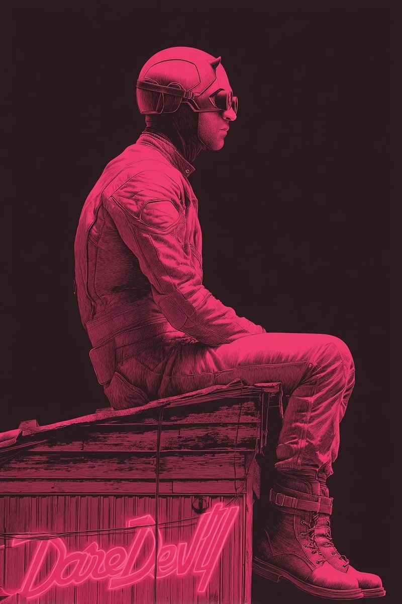 Создано на основе запроса: Digital painting cover of a comics book of a Daredevil in red spectacles and superhero suit sitting on the roof, text "Daredevil", dark colors, dramatic mood, black background --- Автоперевод: Цифровая живопись обложка комиксов книги Сорвиголовы в красных очках и костюме супергероя, сидя на крыше, текст "Сорвиголова", темные цвета, драматическое настроение, черный фон Хорошо выглядит? 🤔 https://dzen.ru/id/65c0c65c86e4f837c27b24d7 #ИИ #AI #нейросеть #midjourney #art