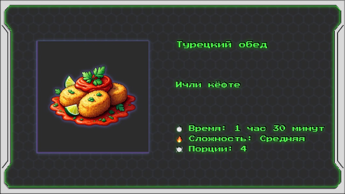 Турецкий обед Ичли кёфте (кёфте с начинкой из фарша и орехов) Этот рецепт представляет собой традиционное турецкое блюдо — ичли кёфте, которое состоит из внешнего слоя из булгура и внутренней начинки из мясного фарша с орехами. Это сытное и ароматное блюдо идеально подходит для обеда и отражает богатство турецкой кухни. Информация о рецепте: ⏱️ Время: 1 час 30 минут 🔥 Сложность: Средняя 🍽 Порции: 4 Ингредиенты: Для внешнего слоя: • 🌾 Булгур (мелкий) — 200 г • 💧 Вода (горячая) — 400 мл • 🫒 Оливковое масло — 2 столовые ложки • 🧂 Соль — по вкусу Для начинки: • 🥩 Говяжий или бараний фарш — 300 г • 🌰 Грецкие орехи (мелко рубленые) — 50 г • 🧄 Чеснок (измельчённый) — 2 зубчика • 🌶 Паприка молотая — 1 чайная ложка • 🌿 Молотый кориандр — ½ чайной ложки • 🧂 Соль — по вкусу • 🌶 Молотый чёрный перец — по вкусу Для соуса: • 🍅 Томатная паста — 2 столовые ложки • 💧 Вода — 200 мл • 🌿 Молотый кориандр — щепотка Для подачи: • 🌿 Петрушка свежая — для украшения • 🍋 Дольки ли
