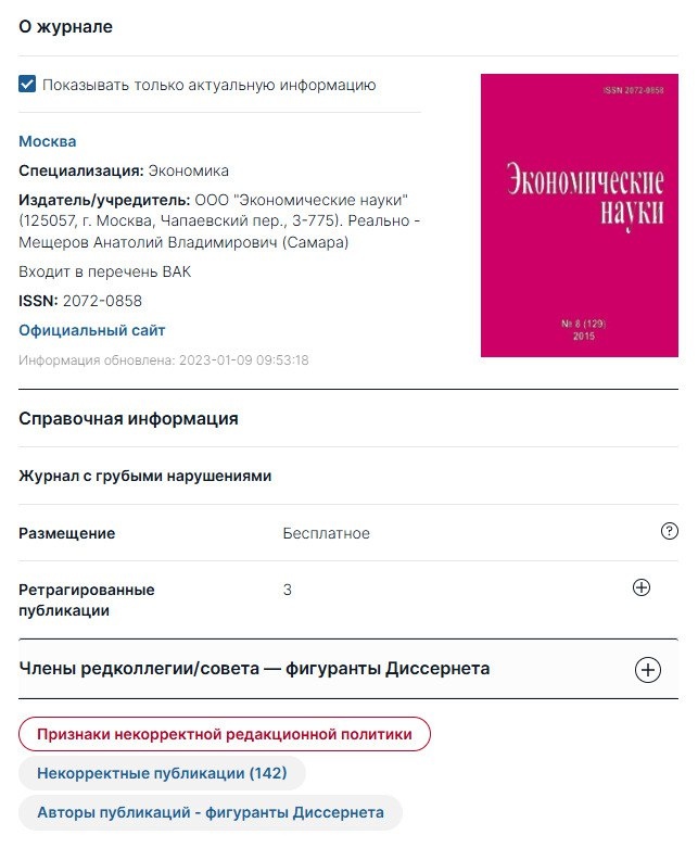 Экономические науки Специализация: Экономика Издатель/учредитель: ООО "Экономические науки" (125057, г. Москва, Чапаевский пер., 3-775). Реально - Мещеров Анатолий Владимирович (Самара) Входит в перечень ВАК https://www.dissernet.org/magazine/ekonomicheskiye_nauki