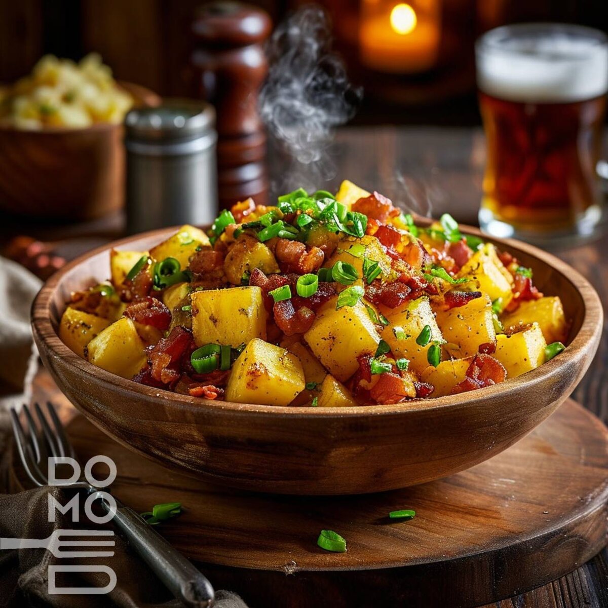 🥔 НЕМЕЦКИЙ КАРТОФЕЛЬНЫЙ САЛАТ С БЕКОНОМ Традиционный теплый салат с насыщенным вкусом. ⏳ Время: 40 мин 🍽 Калорийность: 380 ккал/порция ❤️💛❤️💛💛💚❤️💛💛💚💚 (на 2 порции): - Картофель (средний) — 4 шт (лучше восковой) - Бекон сырокопченый — 4 ломтика (~80 г) - Зеленый лук — 50 г - Растительное масло — 1 ст.л. Для заправки: - Мука — 1 ст.л. - Сахар — 2 ст.л. - Вода — 3 ст.л. - Уксус белый винный — 2 ст.л. - Соль, перец — по вкусу 💚💛❤️❤️❤️💚❤️💛❤️💛💛❤️💛 1️⃣ Картофель: 1. Отварите в кожуре до мягкости (вилка должна легко входить). 2. Остудите, очистите, нарежьте кубиками 1 см. 2️⃣ Бекон: 1. Обжарьте на среднем огне до хруста. 2. Выньте, сохраните жир, нарежьте бекон соломкой. 3️⃣ Заправка: 1. В беконном жире обжарьте муку 1 мин. 2. Добавьте сахар, воду, уксус. 3. Варите 3-4 мин до загустения. 4️⃣ Сборка: 1. В сковороду с заправкой добавьте картофель, бекон, лук. 2. Прогрейте 2 мин, помешивая. 3. Сразу подавайте. 💡 Советы: ✓ Подавайте с квашеной капустой ✓ Замените уксус
